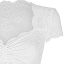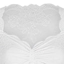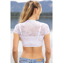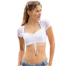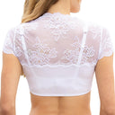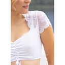 Sowohl die angeschnittenen Ärmel, wie auch um die Schultern, ist die Trachtenbluse aus halbtransparenter Spitze, die mit einem Rosenmuster und floralen Elementen designt ist. Der Brustbereich und auch der untere Rücken ist mit weichem, blickdichten Stoff unterlegt und mit der Raffung können Sie selbst die Tiefe Ihres Ausschnitts bestimmen. Der eingearbeitete Gummizug am Blusenabschluss verleiht der kurzen Spitzenbluse einen perfekten Sitz und eine gute Passform.