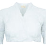 Die halbärmelige Spitzenbluse wird vorne über kreuz geschlossen und rechts und links geknöpft. Ein kleiner Druckknopf sorgt für einen guten Sitz am Ausschnitt. Der eingearbeitete Gummizug am Blusenabschluss garantiert eine perfekte Passform.
