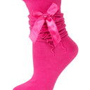Schöne Strümpfe mit seitlicher Rüsche und einer Schleife in Seidenoptik für Damen.