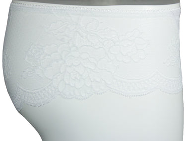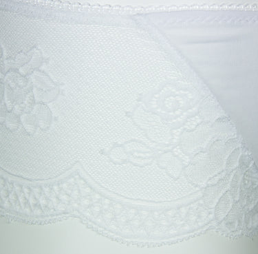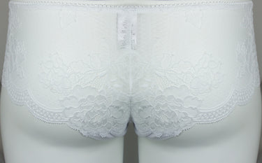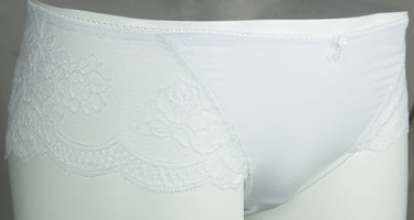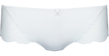 Der weiße Hipster ist zum Teil vorne blickdicht gestaltet und an den Vorderseiten und hinten komplett mit duftiger, floral dessinierter Stricktex-Spitze gearbeitet. Der Slip ist vorne mit einer kleinen Schleife, Blume und kleinen Perlen verziert. Die Unterwäsche ist pflegeleicht und formbeständig, auch nach vielen Wäschen.