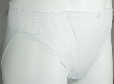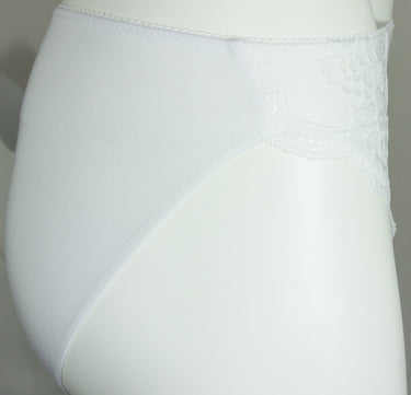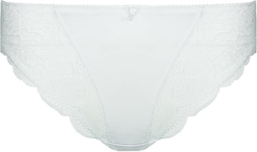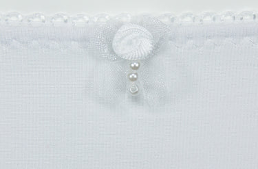 Die weiße Jazzpant ist zum Teil vorne und komplett hinten blickdicht gestaltet und an den Vorderseiten mit duftiger, floral dessinierter Stricktex-Spitze gearbeitet. Der Slip ist vorne mit einer kleinen Schleife, Blume und kleinen Perlen verziert. Die Unterwäsche ist pflegeleicht und formbeständig, auch nach vielen Wäschen.