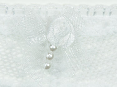 Der weiße Stringtanga ist zum Teil vorne unterhalb und hinten komplett blickdicht gestaltet und vorne oberhalb mit duftiger, floral dessinierter Stricktex-Spitze gearbeitet. Der Slip ist vorne mit einer kleinen Schleife, Blume und kleinen Perlen verziert. Die Unterwäsche ist pflegeleicht und formbeständig, auch nach vielen Wäschen.
