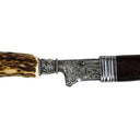 Das Messer besitzt einen unverwüstlichen, echten Hirschhorngriff und eine extrem harte und robuste Messerklinge aus hochwertigem Damast. Die Messerklinge besteht aus 176 Lagen Damast und besitzt dadurch eine unübertroffene Schärfe, Schneidleistung und Schneidhaltigkeit, benötigt daher aber eine gewisse Pflege, da die Klinge nicht rostfrei ist. Neben der Messerklinge ist auch der Messergriff ein echter Blickfang und spiegelt hier die Einzigartigkeit der Natur wieder. Das Ende des Griffs ist mit einer versilberten Zierkappe, auf der ein Hirsch aufgesetzt ist, veredelt. Um die Kappe und das Zwischenteil ist das Messer mit versilbertem Eichenlaub verziert. Neben dem schönen Trachten Messer wird noch eine Stilettscheide mitgeliefert. Diese ist antik versilbert und mit Beschlagteilen aus Messingfeinguß verziert.