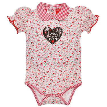 Ein echtes Highlight ist das niedliche Trachtenherz „i mog di“, das mit funkelnden Strasssteinen und einem wattierten Anhänger verziert ist. Dieses Herzchen ist nicht nur ein schöner Blickfang, sondern unterstreicht auch die Liebe zum Detail, die in der Herstellung dieses Bodys steckt. Das verspielte Design macht den Body zu einem echten Schmuckstück im Kleiderschrank jeder kleinen Alpenprinzessin.