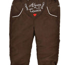 Diese coole Stoffhose im Lederhosen Style für Babys und Mädchen besticht mit seiner aufwändigen Verarbeitung. Die braune Kinderhose mit dem herzförmigen Latz, den Herztrachtenknöpfen und der trachtigen Stickerei, in Kombination mit der rot weiß karierten Fütterung, begeistert große und kleine Trachtenfans und hält im Winter und an kühlen Herbsttagen schön warm.