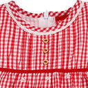 Das rot weiß karierte Sommerkleid ist aus luftiger Baumwolle gefertigt und wird hinten mit einem Reißverschluß geschlossen. Verziert ist das Trachtenkleid mit niedlichen, gestickten Blumen und drei süßen Holzknöpfen in Herzform. Eine weiße zarte Spitzenbordüre veredelt den Ausschnitt und rundet das Gesamtbild perfekt ab.