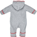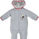 Der zauberhafte Overall vom Hersteller BONDI ist aus herrlich flauschigem, grauen Fleece und an den Säumen mit rot weiß kariertem Stoff eingefasst. Die Kapuze ist innen mit einem Single Jersey gefüttert. Der durchgehende Reißverschluss sorgt für einfaches An- und Ausziehen und ein süßer Kuh-Aufnäher an Brust und Kapuze ist ein toller Blickfang.