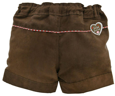 Mit viel Liebe zum Detail gearbeitet, finden sich bunte Blumenstickereien und Hornknöpfe in Herzform auf der braunen Webshort. Auf der Rückseite der kurzen Hose ist ein kleines Herz mit Süße aufgenäht. Der größenverstellbare Gummibund sorgt für einfaches An- und Ausziehen.