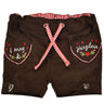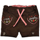 Diese kurze Hose im Lederhosen Stil wird Ihr kleines Mädchen bestimmt begeistern! Die Kinder Short ist ein echter Hingucker auf Oktoberfest, Volksfest oder im Kindergarten! Die Trachtenhose ist aus einem weichen Material hergestellt und fühlt sich dadurch besonders angenehm auf der Haut an. Mit viel Liebe zum Detail gearbeitet finden sich bunte Blumenstickereien und Hornknöpfe in Herzform auf der braunen Kinderhose. Auf der Rückseite der kurzen Hose ist ein kleines Herz aufgenäht. Ein Gummibund sorgt für einfaches An- und Ausziehen. Ein rundum schönes Geschenk auch für das Patenkind oder Enkelkind!