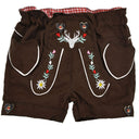 Diese kurze Hose im Lederhosen Stil wird Ihr kleines Mädchen bestimmt begeistern! Die Kinder Bermuda ist ein echter Hingucker auf Oktoberfest, Volksfest oder im Kindergarten! Die Trachtenhose ist aus einem weichen Material hergestellt und fühlt sich dadurch besonders angenehm auf der Haut an. Mit viel Liebe zum Detail gearbeitet finden sich bunte Blumenstickereien und Hornknöpfe in Herzform auf der braunen Kinderhose. Auf der Rückseite der kurzen Hose ist ein kleines Herz aufgenäht. Ein Gummibund sorgt für einfaches An- und Ausziehen. Ein rundum schönes Geschenk auch für das Patenkind oder Enkelkind!
