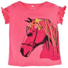 Das zauberhafte pinke T-Shirt ist vorne mit einem großen Pferdekopf verziert. Die Blumen und Blätter Applikationen, der goldene Glitter in der Pony Mähne und nicht zuletzt die niedlichen Rüschen an den Ärmeln machen das Kurzarmshirt zum allerliebsten Hingucker.