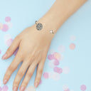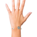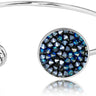Der Damenschmuck ist mit einer großen, runden Einfassung versehen, die viele kleine Kristalle von Swarovski ziert und einer kleinen Einfassung mit einem kristallfarbenen Kristall von Swarovski. Der Armreif kann leicht gebogen werden, wodurch er sich jedem Handgelenk anpasst.