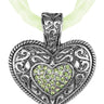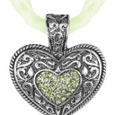 Das Band ist aus einem schönen, leicht glänzenden Chiffon- und Satinmaterial hergestellt, der Herz Anhänger ist mit Ornamenten verziert. Das Herzinnere ist mit farblich zum Band abgestimmten Swarovski Elementen in Herzform besetzt. Durch einen Magnet Klappverschluss lässt sich der Anhänger ganz leicht auch an anderen Ketten und Halstüchern befestigen. Die Anhängerrückseite zieren viele kleine süße Herzchen. Die Halskette wird mit einem Karabinerhaken geschlossen und besitzt noch ein kleines Verlängerungskettchen.