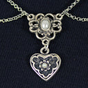 Die silberne Kette besteht aus feinen Erbskettengliedern, die im vorderen Bereich links und rechts doppelreihig ist und in zwei Bögen fällt. Dadurch wirkt das Collier sehr elegant und ist auf alle Fälle ein zauberhafter Hingucker. Den Mittelpunkt bildet der Anhänger, bestehend aus einer Ornamentblüte mit einer seidig schimmernden Perle und dem darunter gesetzten Herz.