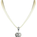 Das Kettenband ist als seidig glänzendes Satinband unterlegt mit einer Satinkordel gestaltet. Der Clou ist jedoch der bezaubernde, ornamentverzierte Herzanhänger. Er ist zur Mitte hin halb geöffnet und birgt eine cremig weiße Perle.