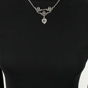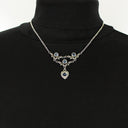 Die in Altsilber Optik gestaltete Kette hat im vorderen Bereich drei wunderschön geschwungene Ornamente, die jeweils mit einem Swarovski Stein besetzt sind. Die Ornamente sind im Dreieck angeordnet und ein hübsches Herz mit einem Swarovski-Element bildet den Abschluss.