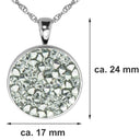 Der Anhänger des Damenschmuckes ist mit einer großen, runden Einfassung versehen, die viele kleine Kristalle von Swarovski ziert. Die Damenkette wird mit einem Karabinerhaken geschlossen.