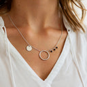Die filigrane Damen Halskette ist hochwertig aus 925 Sterling Silber gearbeitet und lässt sich individuell in der Länge von 50 bis 55 cm tragen. Durch die Rhodinierung ist der Schmuck vor dem Anlaufen geschützt. Als Anhänger sind ein Ring Element, eine silberne Münze und drei kleine Achat Perlen angebracht.