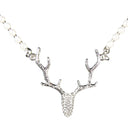 Die Halskette besteht aus vielen Süßwasserperlenimitaten und einem Hirschkopf-Anhänger, welcher komplett mit Kristallen von Swarovski verziert ist. Besonders praktisch ist das Verlängerungskettchens, wodurch sich die Weite am Hals anpassen lässt. Die Halskette wird mit einem Karabinerhaken geschlossen.