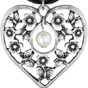 Die schwarze Satinkette hat einen hübschen Herzanhänger im Altsilber Look. Viele kleine Blüten und süße Schmetterlinge zieren das Herz und machen es zu einem reizenden Blickfang. Eine anmutig schimmernde Perle bildet den Mittelpunkt des Herzens und rundet das Bild wunderschön ab. Durch das Verlängerungskettchen können Sie Ihre individuelle Länge des Halsschmuckes anpassen. Geschlossen wird die Kette mit einem Karabinerverschluss.