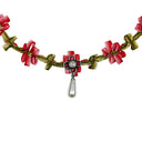 Das Band besteht aus einem weichen Stoff in Blumen und Blätter Muster und ist mit einer Blüte besetzt, welche mit einer tropfenförmigen Perle und einem Kristall von Swarovski verziert ist. Besonders praktisch ist das Verlängerungskettchens, wodurch sich die Weite am Hals anpassen lässt. Die Halskette wird mit einem Karabinerhaken geschlossen.