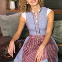 Die abnehmbare Schürze hat ein schönes Streifendesign, sie nimmt perfekt den Farbton des Grundstoffes vom Dirndlkleid auf. Ein traditionelles und doch elegantes Dirndl für Damen, Qualität und Design werden Sie ganz sicher begeistern.