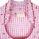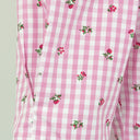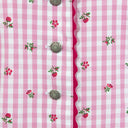Die Bluse ist aus einem angenehm zu tragendem Baumwoll-Material hergestellt und mit pinken Blümchen verziert. Der schön gerüschte, an einen Schneewittchen Kragen erinnernde, Stehkragen macht dieses Trachtenoberteil zu etwas Besonderem. Die Bluse ist schön tailliert geschnitten und wird an Ärmeln, Knopfleiste und Kragen von einem pinken Saum in Wellenform eingefasst. Geschlossen wird die Damenbluse mit silberfarbenen Metallknöpfen, welche mit einem schönen Blumenmuster verziert sind.
