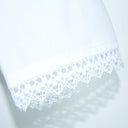 Die schöne weiße Trachtenbluse ist am kompletten Ausschnitt und den Ärmeln mit filigraner Spitze eingesäumt. Der eingearbeitete Gummizug am Blusenabschluss verleiht der Bluse einen perfekten Sitz und eine gute Passform. Die Dirndl Bluse kann vorne für ein verführerisches Dekolleté gerafft werden.