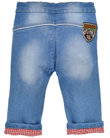 Diese coole Kinder Jeans für Babys und kleine Jungen besticht mit einer aufwändigen Verarbeitung. Eine moderne Waschung im Used Look, kombiniert mit trachtigen Stickereien auf dem Latz und karierte Paspeln machen die Kinderhose zum tollen Hingucker. Die Kinderhose ist perfekt für Oktoberfest und Volksfest und lässt sich auch im Alltag prima kombinieren.