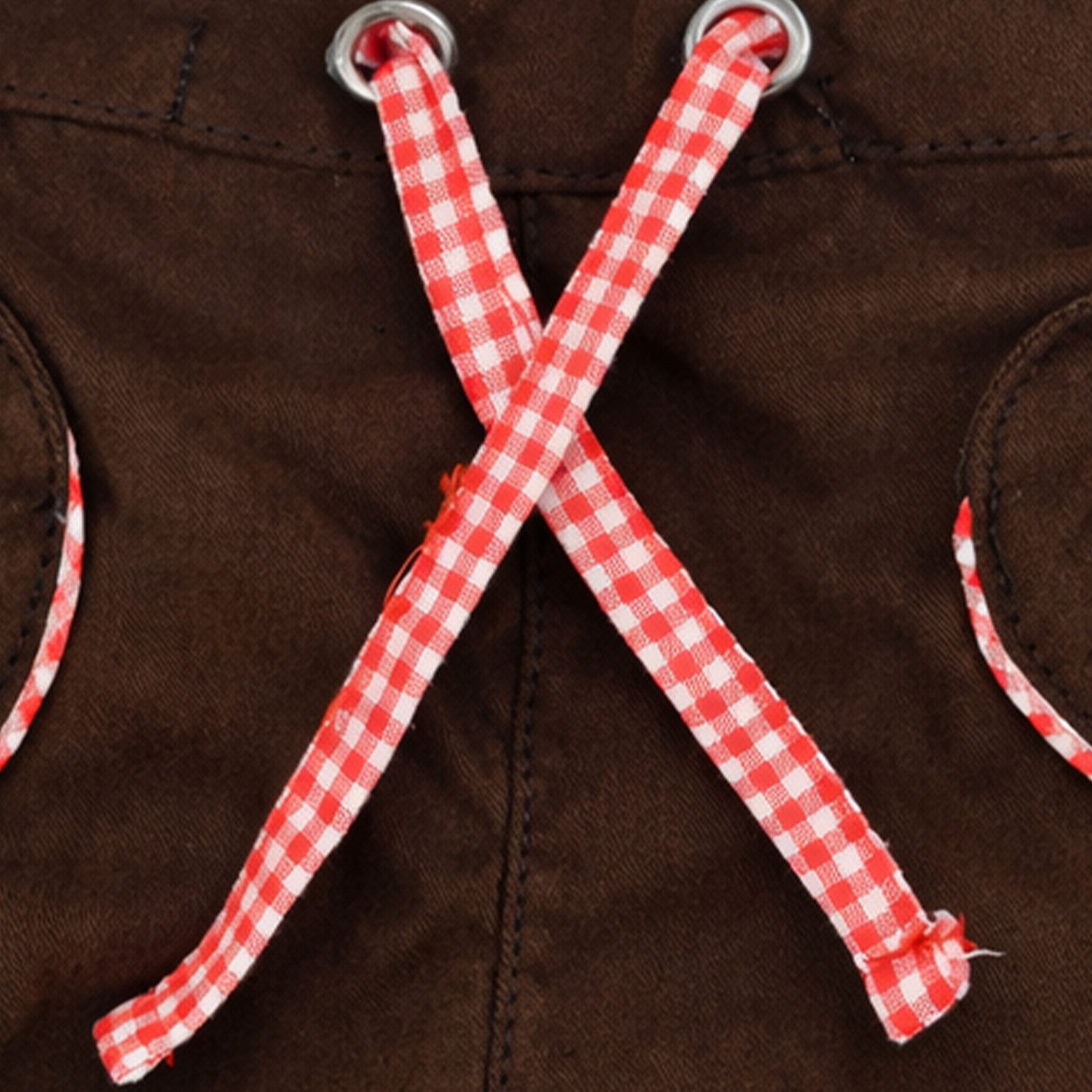 Gefertigt in edler Lederoptik überzeugt die braune Kunstleder Shorts durch ihre liebevollen Details und ihre hochwertige Verarbeitung. Die weiche, angenehm zu tragende Qualität sorgt dafür, dass sich Ihr Kind rundum wohlfühlt – ganz ohne steifes Materialgefühl. Der elastische Bund garantiert einen bequemen Sitz und macht das An- und Ausziehen besonders unkompliziert. Ein dekoratives Bindeband in rot-weißem Karo unterstreicht den klassischen Trachten-Look und setzt einen charmanten Akzent.