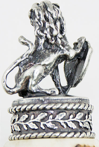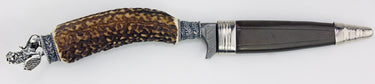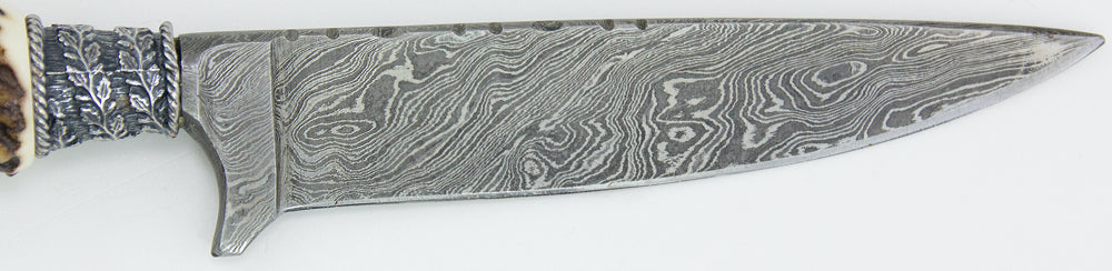 Das Messer besitzt einen unverwüstlichen, echten Hirschhorngriff und eine extrem harte und robuste Messerklinge aus hochwertigem Damast. Die Messerklinge besteht aus 176 Lagen Damast und besitzt dadurch eine unübertroffene Schärfe, Schneidleistung und Schneidhaltigkeit, benötigt daher aber eine gewisse Pflege, da die Klinge nicht rostfrei ist. Neben der Messerklinge ist auch der Messergriff ein echter Blickfang und spiegelt hier die Einzigartigkeit der Natur wieder. Das Ende des Griffs ist mit einer versilberten Zierkappe, auf der ein sitzender Löwe mit Bayernwappen aufgesetzt ist, veredelt. Um die Kappe und das Zwischenteil ist das Messer mit versilbertem Eichenlaub verziert. Neben dem schönen Trachten Messer wird noch eine Stilettscheide mitgeliefert. Diese ist antik versilbert und mit Beschlagteilen aus Messingfeinguß verziert.