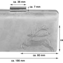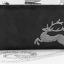 Die Clutch ist aus einem Material in Rauleder/Veloursleder Optik gearbeitet und wird mit einem Clipverschluss geschlossen. Sie hat ein großes Hauptfach und wird mit einer langen, abnehmbaren Kette zum Umhängen geliefert. Auf der vorderen Seite ist in der unteren Ecke ein springender Hirsch gestickt und verleiht der Damentasche einen trachtigen Touch.