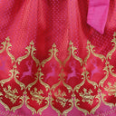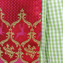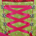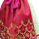 Das Oberteil ist aus hellgrünem, seidig glänzenden Stoff mit floralem pinken und rosa Muster. Die Schnürung erfolgt mit einem pinken Satinband. Am Ausschnitt befinden sich süße rote Rüschen mit pinken Punkten. Der Rock besteht aus grün-weiß kariertem, festen Baumwollstoff. Am Saum findet sich das pinke Satinband wieder. Die wunderschöne Schürze ist aus glänzendem, roten Stoff mit pinken Punkten. Verziert ist sie mit entzückendem gestickten Hirschmotiv und grünen Ornamenten. Gebunden wird die Schürze mit einem pinken, breiten Band.