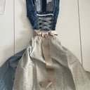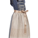 Unser bezauberndes Kinder- und Jugend Dirndl Marina von Isar-Trachten für Mädchen und Teenager ist mit viel Liebe zum Detail gefertigt und wird Ihre Tochter und Sie mit Sicherheit begeistern. Das Oberteil des charmanten Jugenddirndls ist in Dunkelblau gehalten und hat ein zartes, glitzerndes Muster in Silber. Am eckigen Ausschnitt befindet sich eine hübsche Rüsche, die mit einer Perlenbordüre zusätzlich betont wird. Die Miederschnürung wird mit einem Organzaband gebunden, das von schön verzierten altsilbernen Miederhaken gehalten wird. Im Rücken hat das Mädchendirndl einen Reißverschluss. Der Rock des Trachtenkleides ist aus einem fein-gepunkteten Baumwollstoff hergestellt und bildet so einen schönen Kontrast zum Oberteil. Highlight ist hier zusätzlich die graue Schürze mit silber-glitzerndem Ornamentdruck, die das Dirndl perfekt abrundet. Ein zauberhaftes Trachtenkleid für feierliche Anlässe und auch besonders schön für den Besuch beim Volks- oder Oktoberfest.