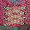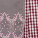 Das Oberteil des charmanten Jugenddirndls ist mit rosa floralen Elementen und kleinen Hirschen verziert und ist im Farbton Beere unterlegt. Am Dekolleté befindet sich eine hübsche graue Rüsche, passend zum Schürzenstoff. Die Miederschnürung wird mit einem hellgrünen Organzaband gebunden, dass im Kontrast zu den harmonischen Farben steht und dem Dirndl das gewisse Etwas verleiht.