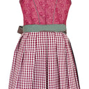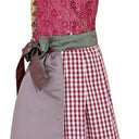 Der Rock des Trachtenkleids ist aus weiß dunkelrot kariertem Stoff. Dadurch wird der trachtige Charakter wunderschön unterstrichen und die graue Schürze mit den hübschen Hirschköpfen und Blumen in Rosa und Grün rundet das Trachtenoutfit perfekt ab.