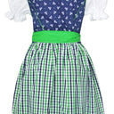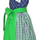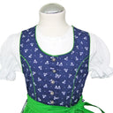 Dieses zauberhafte Dirndl aus der Kollektion von Isar-Trachten besteht aus Trägerkleid, Bluse und Schürze. Das liebevoll gearbeitete Dirndl für Mädchen besitzt einen karierten Rock und das Oberteil ist mit kleinen Blumen bestickt. Das Kinderdirndl wird vorne mit kleinen Metallknöpfen in Form von Blumen geschlossen! Die Schürze hebt sich durch das leuchtende Grün besonders schön von dem Dirndl ab. Die passende Bluse in weiß wird natürlich mitgeliefert. Das perfekte dreiteilige Mädchendirndl für Kirchweih und Sonntagsausflüge.