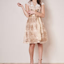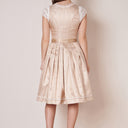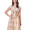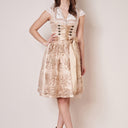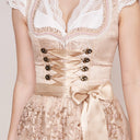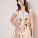 Das Dirndl Kailia von Krüger MADL besticht durch eine tolle Farbgebung in zartem Natur mit rosé-farbenen Akzenten, es kommt hier in einer knielangen Form mit 60 cm. Das zartschimmernde Ornamentenmuster trifft auf eine atemberaubende Spitzenschürze mit glitzernden Steinchen und rosa Perlen. Ein Kleider-Traum in frischem Farbton aus dem Hause Krüger, der Sie mit einem romantischen Look und der tollen Verarbeitung und Qualität mit Sicherheit überzeugt. Der tiefe Herzausschnitt wird mit einer Rüsche und Borten besonders betont und Strass-besetzte Miederhaken mit kleinen Herzen zieren das Mieder. Geschlossen wird das Damendirndl vorn mit einem Reißverschluss, der von der Schnürung gekonnt verdeckt wird. Die wunderschöne Schürze mit floralem Muster rundet das Gesamtbild perfekt ab.