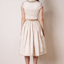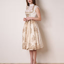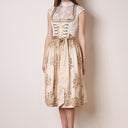 Das traumhafte Dirndl Neila aus dem Hause Krüger Dirndl besticht durch einen traditionellen, romantischen Stil, der durch die schöne Ton-in-Ton Farbkombination in Natur besonders hervorgehoben wird. Das Kleid kommt in einer 70er Länge und wird Sie mit seinem eleganten Look und der tollen Verarbeitung und Qualität mit Sicherheit überzeugen. Das Mieder ist aus einem Stoff im Leinenlook gefertigt, der Rock hat ein schönes Ornamentmuster und ist aus einem leicht glänzenden Material. Cremefarbene Borten bilden einen schönen Kontrast. Der tiefe Ausschnitt ist mit Rüschenbordüren eingefasst und Strass-besetzte Miederhaken zieren das Mieder. Geschlossen wird das Damendirndl vorn mit einem Reißverschluss, der von der Schnürung gekonnt verdeckt wird. Die opulente Schürze ergänzt das zauberhafte Dirndl perfekt, sie ist mit Perlen und Strass besetzt und rundet das Gesamtbild perfekt ab.