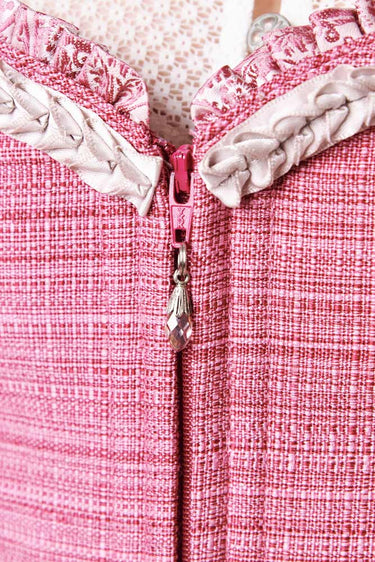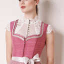 Das traumhafte Dirndl Pati aus dem Hause Krüger Dirndl besticht durch einen traditionellen, romantischen Stil, der durch die schöne Ton-in-Ton Farbkombination in Pink und Creme besonders hervorgehoben wird. Das Kleid kommt in einer 70er Länge und wird Sie mit seinem eleganten Look und der tollen Verarbeitung und Qualität mit Sicherheit überzeugen. Das Mieder ist aus einem Stoff im Leinenlook gefertigt, der Rock hat ein schönes Ornamentmuster und ist aus einem leicht glänzenden Material. Cremefarbene Borten bilden einen schönen Kontrast. Der tiefe, herzförmige Ausschnitt ist mit Rüschenbordüren eingefasst, geschlossen wird das Damendirndl vorn mit einem Reißverschluss. Die opulente Schürze ergänzt das zauberhafte Dirndl perfekt, sie ist mit Perlen und Pailletten besetzt und rundet das Gesamtbild perfekt ab.