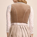 Unser traditionelles Dirndl Elinda ist ein wahres Meisterwerk, das durch seine bezaubernde Ausstrahlung und die Liebe zum Detail beeindruckt. Es kombiniert auf harmonische Weise klassische Elemente mit modernen Akzenten und schafft so ein perfektes Gleichgewicht zwischen Tradition und zeitgemäßem Stil. Das Mieder, gefertigt aus feinstem Cord, verleiht dem Dirndl eine einzigartige Textur und sorgt für eine elegante, aber dennoch gemütliche Passform. Der gerade Ausschnitt, der dezent mit einer zarten, dekorativen Borte eingefasst ist, betont gekonnt den femininen Charakter des Dirndls, ohne dabei aufdringlich zu wirken. Diese Details verleihen dem Dirndl nicht nur eine ansprechende Optik, sondern sorgen auch für eine angenehme Trageerfahrung.