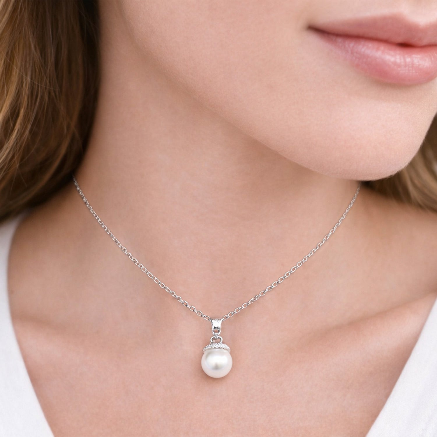 Das silberne Collier ist mit einem Perlenanhänger verziert, dessen Perlenkäppchen mit vielen herrlich funkelnden Premium Kristallen besetzt ist. Durch das leichte Material liegt die Halskette sehr schön am Hals an und bringt Ihr Dekolleté wunderbar zur Geltung. Einfach bezaubernd!