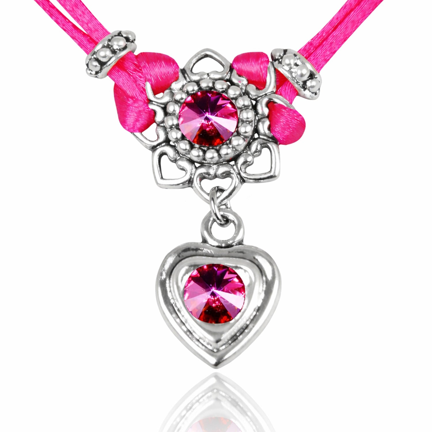 Die Kette ist aus einem seidig glänzenden, doppelreihigen Satinband und schmiegt sich herrlich am Hals an. Die wunderschöne Herzblüte mit einem funkelnden Premium Kristall bildet den Mittelpunkt der Kette und hat einen süßen Anhänger in Form eines kleinen Herzens mit einem glitzernden Schmuckstein.