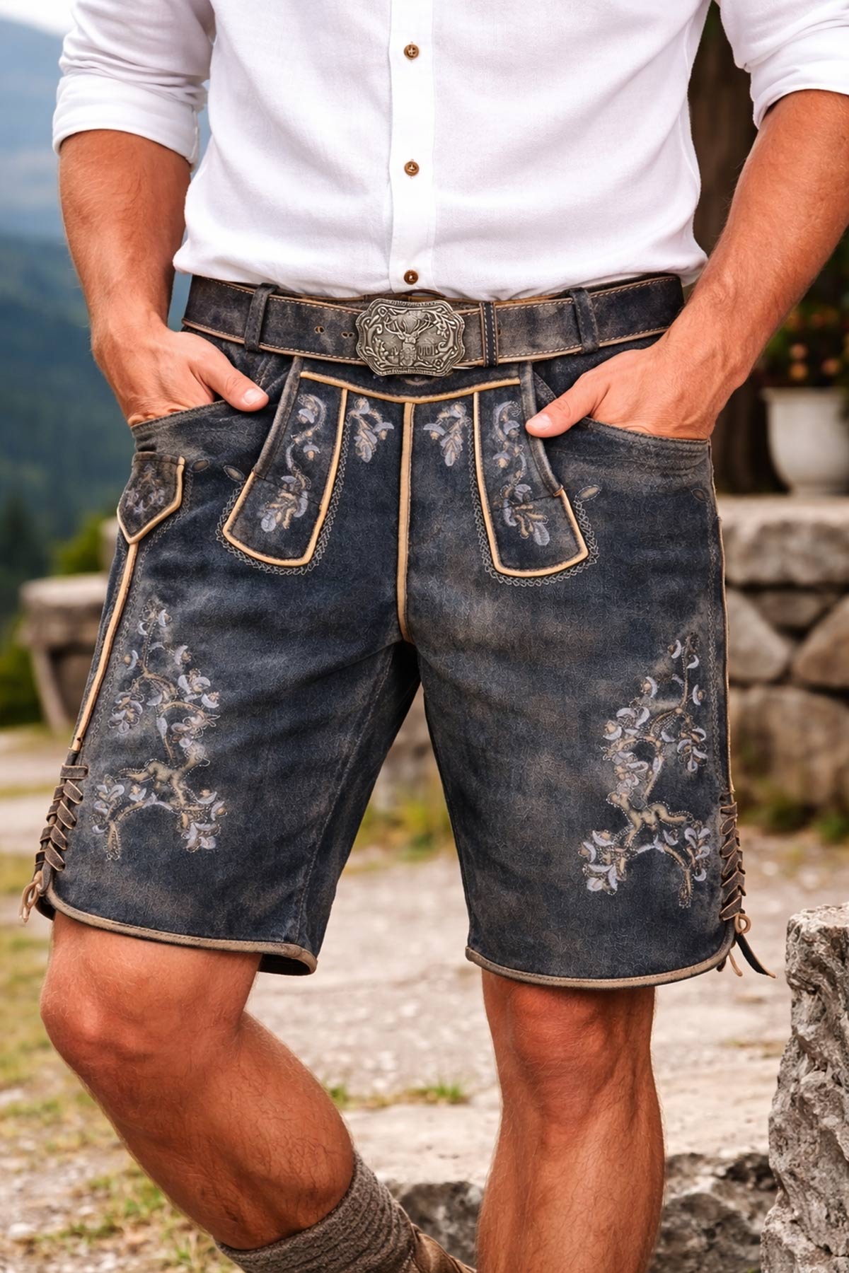 Typisch für eine originale bayerische Lederhose sind die detailreich gestaltete Messertasche, die dekorative Bein-Schnürung sowie die traditionellen Knöpfe am Beinabschluss. Der mitgelieferte Gürtel mit markanter Metallschließe rundet das Gesamtbild stilvoll ab und sorgt gleichzeitig für einen optimalen Sitz. Ob kombiniert mit Trachtenhemd, Haferlschuhen oder Strickjacke – diese kurze Lederhose für Herren lässt sich vielseitig stylen und garantiert einen souveränen Auftritt.