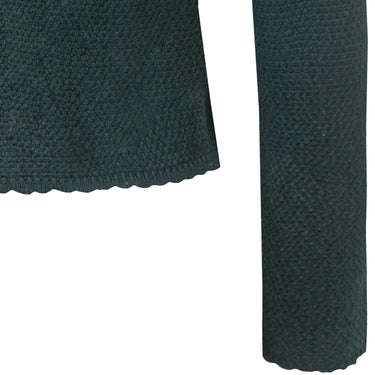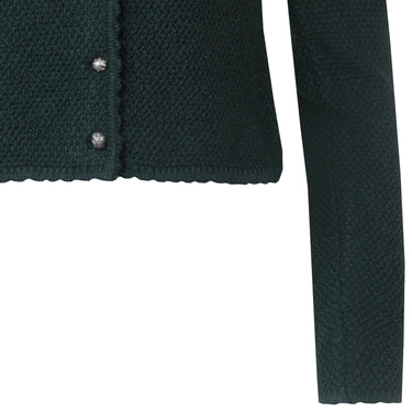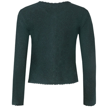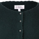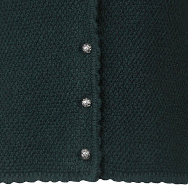 Die Damen Trachten Strickjacke in einem eleganten Tannengrün ist ein zeitloses Kleidungsstück, das Tradition und moderne Eleganz perfekt vereint. Sie ist die ideale Ergänzung zu jedem Trachtenoutfit, ob zur Lederhose, zum Dirndl oder als stilvoller Begleiter im Alltag. Der gerade Schnitt sorgt für eine feminine Silhouette, während der runde Halsausschnitt dem Design eine klassische Note verleiht. Die durchgehende Knopfleiste ist mit liebevoll gestalteten Knöpfen versehen, die mit ihrer filigranen Musterung einen dezenten Blickfang setzen und die Strickjacke noch hochwertiger wirken lassen.